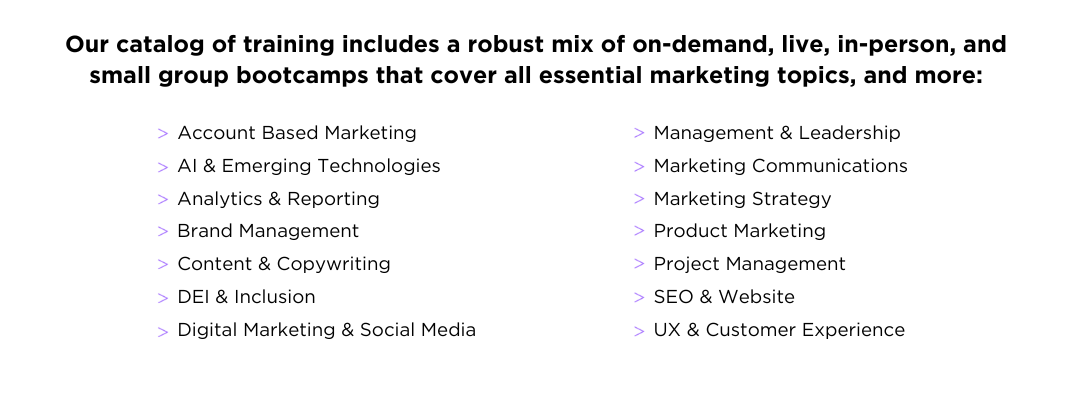 Every organization is unique, and so are its professional development needs. That’s why our training programs cover a wide range of outcomes-based topics that cater to the diverse demands of marketing teams. Help your employees stay ahead, gain the skills necessary to excel in their careers and contribute to your organization’s success.